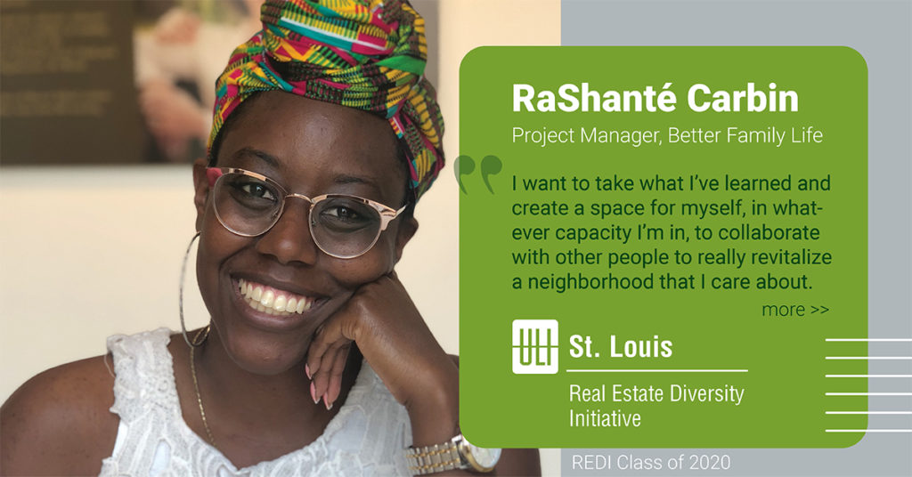 RaShante credits that background with forming her passion for equitable socio-economic development. She pursued the ULI St. Louis REDI program and graduated with the intent to leverage her skills as a social worker toward investing in those communities—her communities.